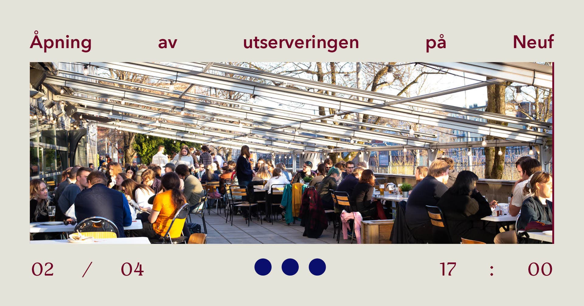 Vi åpner den etterlengtede og ettertraktede uteserveringen vår! Tirsdag 2. april blir det mat og DJ i Betonghaven, etterfulgt av quiz.